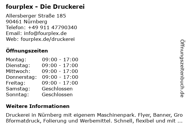 | Öffnungszeiten fourplex - Die Druckerei in Nürnberg anzeigen | |