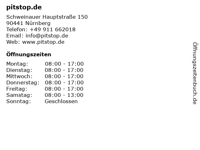 | Öffnungszeiten pitstop.de in Nürnberg anzeigen | |
