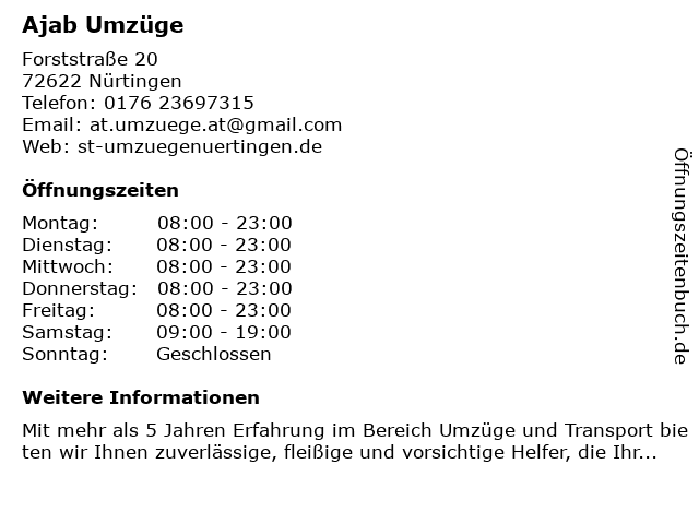 | Öffnungszeiten Ajab Umzüge in Nürtingen anzeigen | |
