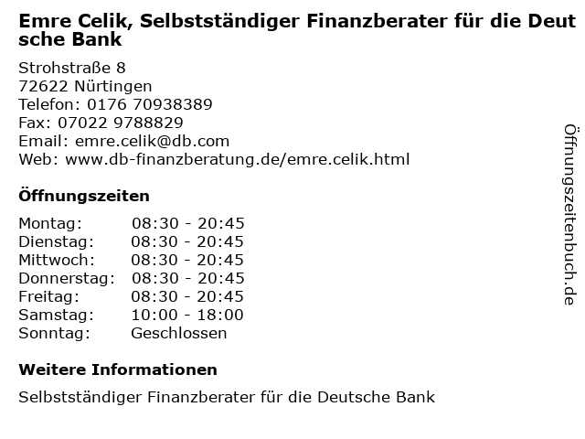Branchen & Suchbegriffe zu Emre Celik, Selbstständiger Finanzberater für die Deutsche Bank:bank, celik, deutsche, emre, finanzberater, selbstständiger |