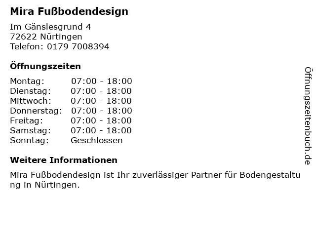 | Öffnungszeiten Mira Fußbodendesign in Nürtingen anzeigen | |