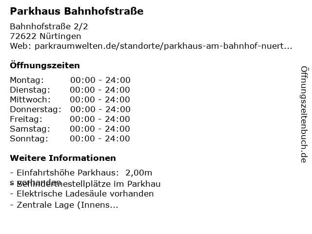 | Öffnungszeiten Parkhaus Bahnhofstraße in Nürtingen anzeigen | |