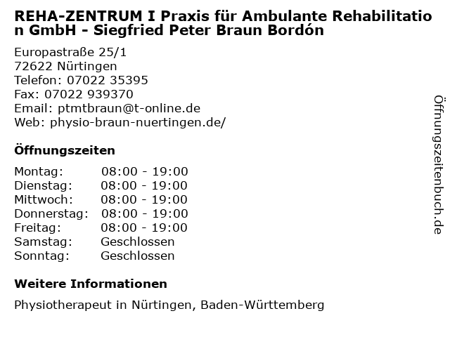 Branchen & Suchbegriffe zu REHA-ZENTRUM I Praxis für Ambulante Rehabilitation GmbH - Siegfried Peter Braun Bordón:ambulante, bordón, braun, ergotherapie, massagetherapie, peter, praxis, reha, reha-zentrum, rehabilitation, siegfried, sportmedizin, zentrum |