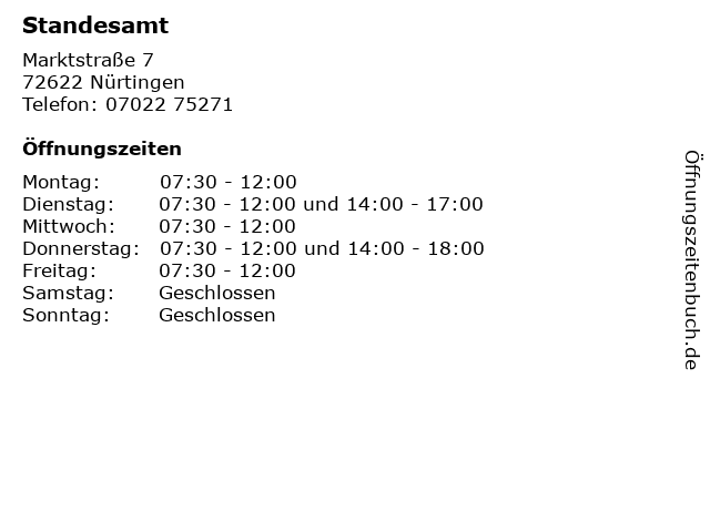 | Öffnungszeiten Standesamt in Nürtingen anzeigen | |