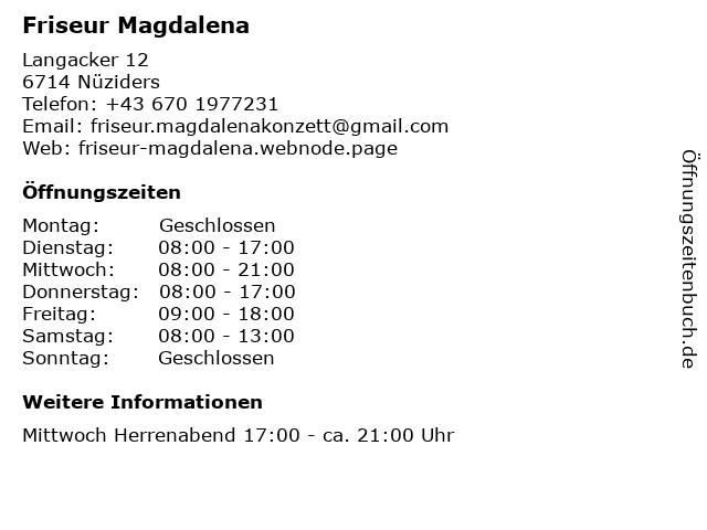 | Öffnungszeiten Friseur Magdalena in Nüziders anzeigen | |
