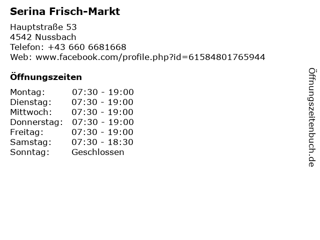 | Öffnungszeiten Serina Frisch-Markt in Nussbach anzeigen | |