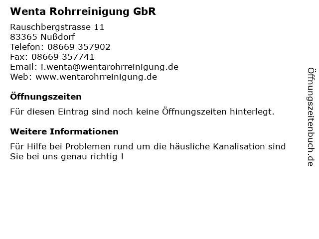 | Öffnungszeiten Wenta Rohrreinigung GbR in Nußdorf anzeigen | |
