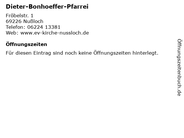 | Öffnungszeiten Dieter-Bonhoeffer-Pfarrei in Nußloch anzeigen | |