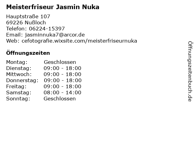 | Öffnungszeiten Meisterfriseur Jasmin Nuka in Nußloch anzeigen | |