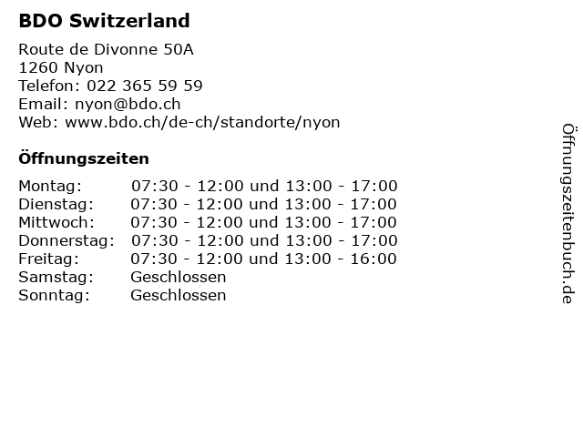 | Öffnungszeiten BDO Switzerland in Nyon anzeigen | |