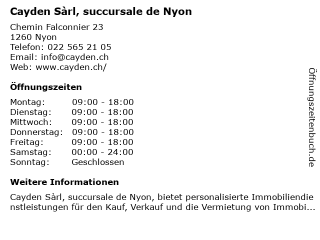| Öffnungszeiten Cayden Sàrl, succursale de Nyon in Nyon anzeigen | |