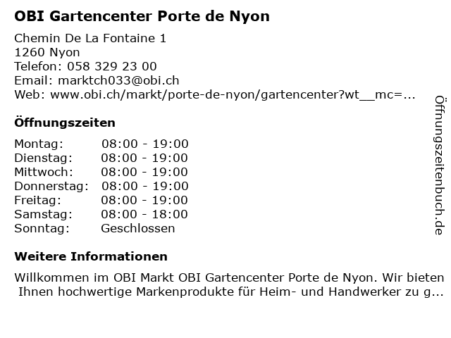 Öffnungszeiten OBI Gartencenter Porte de Nyon in Nyon anzeigen | |