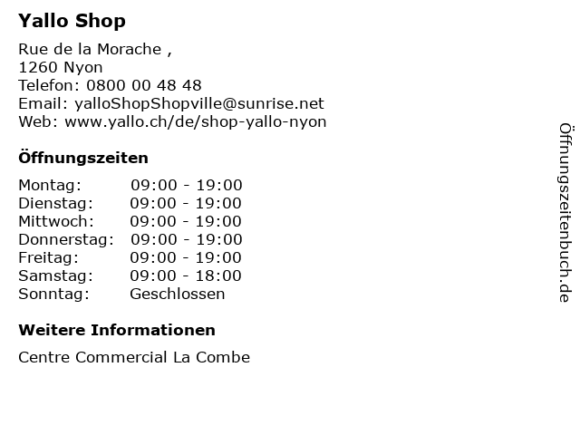 | Öffnungszeiten Yallo Shop in Nyon anzeigen | |