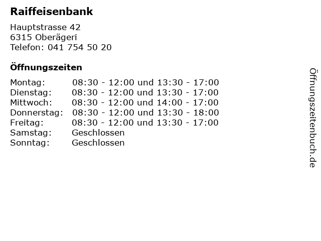 | Öffnungszeiten Raiffeisenbank in Oberägeri anzeigen | |