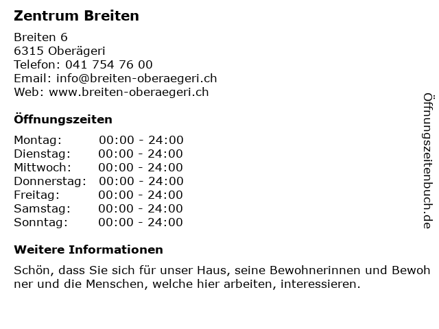 | Öffnungszeiten Zentrum Breiten in Oberägeri anzeigen | |