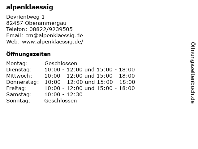 | Öffnungszeiten alpenklaessig in Oberammergau anzeigen | |
