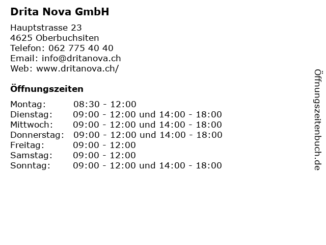 | Öffnungszeiten Drita Nova GmbH in Oberbuchsiten anzeigen | |