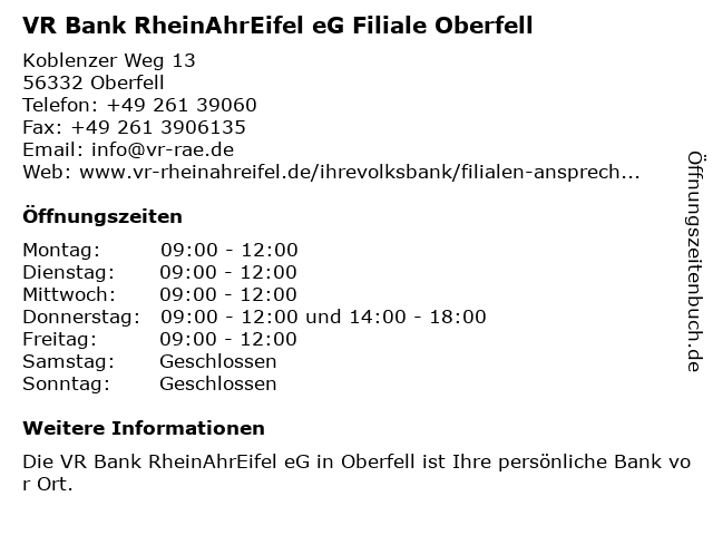 2 VR Bank Rhein-Mosel eG - Geschäftsstelle Oberfell (Entfernung: 0,01 km) Koblenzer Weg 13, 56332 Oberfell 6 |