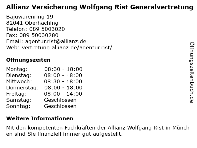1 Allianz Versicherung Gregor Wimbauer Generalvertretung (Entfernung: 0,95 km) Bodenschneidstraße 2, 81549 München 2 Allianz Versicherung - Generalvertretung Tibor Tancsics (Entfernung: 2,36 km) Innsbrucker Ring 152, 81669 München 4 AXA Generalvertretung - Manu Freiherr von Sturmfeder-Brandt (Entfernung: 4,48 km) Rosenheimer Str. 4, 81669 München 5 Manuel Freiherr von Sturmfeder-Brandt , AXA Generalvertretung (Entfernung: 4,49 km) Rosenheimer Str. 4, 81667 München 6 Allianz Versicherung Florian Hummel Generalvertretung (Entfernung: 4,70 km) Eschenstraße 13, 82024 Taufkirchen |