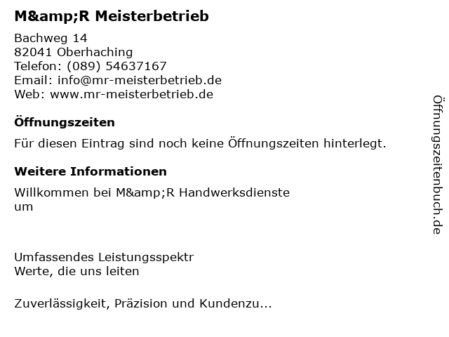 | Öffnungszeiten M&R Meisterbetrieb in Oberhaching anzeigen | |