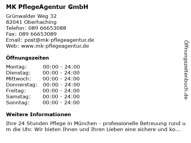 | Öffnungszeiten MK PflegeAgentur GmbH in Oberhaching anzeigen | |