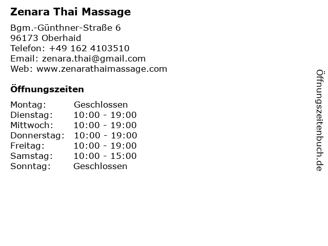 | Öffnungszeiten Zenara Thai Massage in Oberhaid anzeigen | |