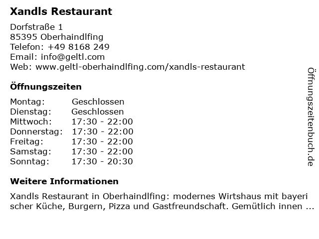 | Öffnungszeiten Xandls Restaurant in Oberhaindlfing anzeigen | |