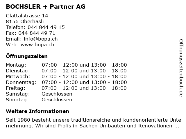 | Öffnungszeiten BOCHSLER + Partner AG in Oberhasli anzeigen | |