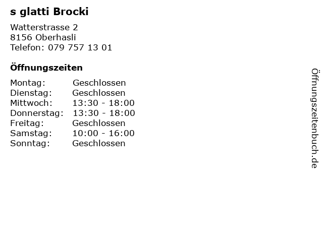 | Öffnungszeiten s glatti Brocki in Oberhasli anzeigen | |