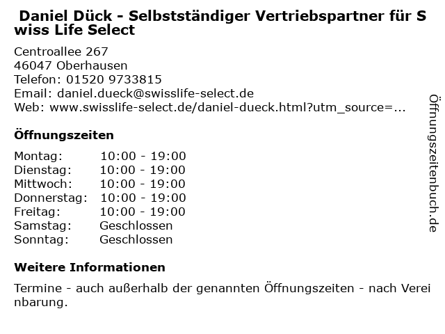 1 Denis Limberg - Selbstständiger Vertriebspartner für Swiss Life Select (Entfernung: 0,01 km) Centroallee 267, 46047 Oberhausen 2 Matthias Holzmann - Selbstständiger Vertriebspartner für Swiss Life Select (Entfernung: 0,01 km) Centroallee 267, 46047 Oberhausen 3 Fabian Sandforth - Selbstständiger Vertriebspartner für Swiss Life Select (Entfernung: 0,01 km) Centroallee 267, 46047 Oberhausen 4 Hartmut Struck - Selbstständiger Vertriebspartner für Swiss Life Select (Entfernung: 0,02 km) Centroallee 267, 46047 Oberhausen 5 Hartmut Schmitz - Selbstständiger Vertriebspartner für Swiss Life Select (Entfernung: 0,02 km) Centroallee 267, 46047 Oberhausen 6 Franz Widmann - Selbstständiger Vertriebspartner für Swiss Life Select (Entfernung: 0,02 km) Centroallee 267, 46047 Oberhausen |