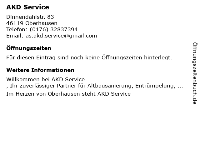 | Öffnungszeiten AKD Service in Oberhausen anzeigen | |