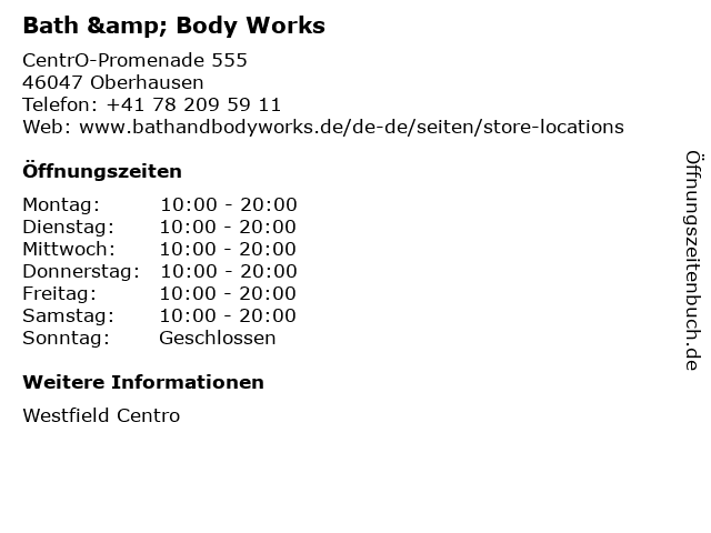 | Öffnungszeiten Bath & Body Works in Oberhausen anzeigen | |