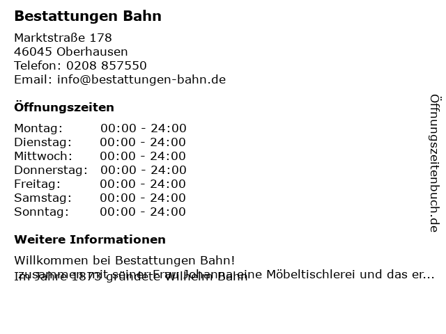 | Öffnungszeiten Bestattungen Bahn in Oberhausen anzeigen | |