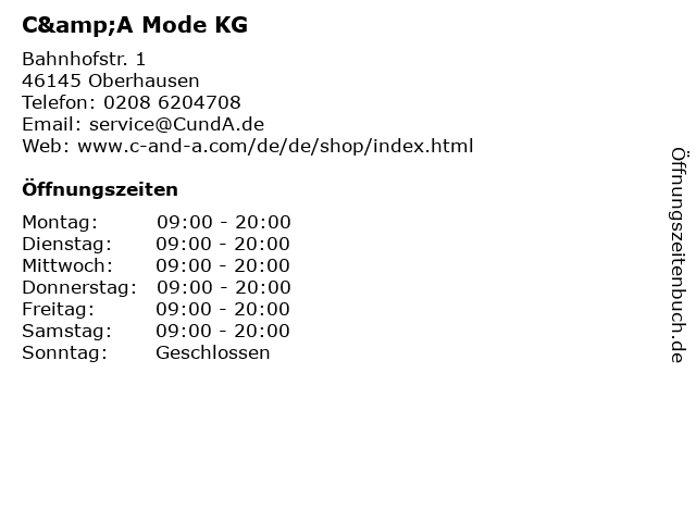 | Öffnungszeiten C&A Mode KG in Oberhausen anzeigen | |