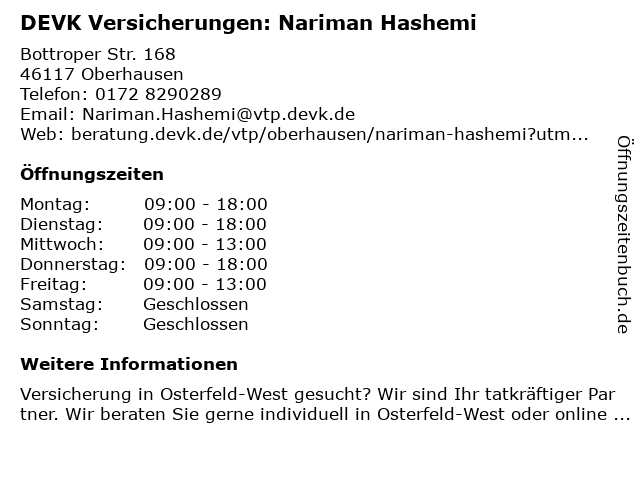 4 DEVK Versicherungen: Kevin Abdulla (Berater*in ausgeschieden) (Entfernung: 2,84 km) Mellinghofer Str. 156, 46047 Oberhausen 6 |