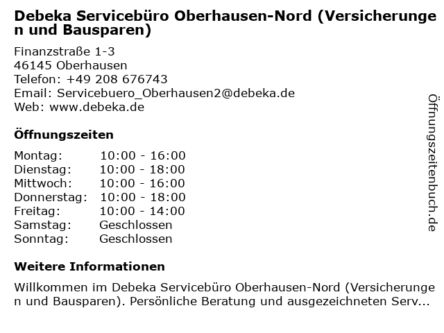 1 Finanzamt Oberhausen-Nord (Sprechzeiten Service- / Informationsstelle) (Entfernung: 0,64 km) Gymnasialstr. 16, 46145 Oberhausen 5 Debeka Geschäftsstelle Oberhausen (Versicherungen und Bausparen) (Entfernung: 3,74 km) Centroallee 261, 46047 Oberhausen 6 Sportvereinigung Sterkrade-Nord 1920/25 e. V. - Clubhauses (Entfernung: 3,87 km) Lütticher Str. 70, 46147 Oberhausen |