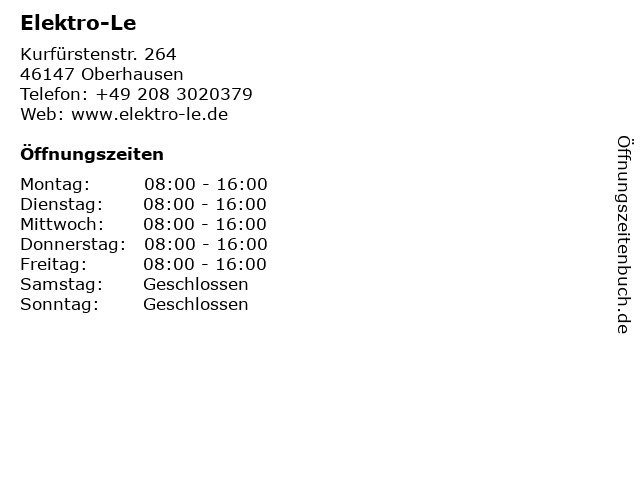 | Öffnungszeiten Elektro-Le in Oberhausen anzeigen | |
