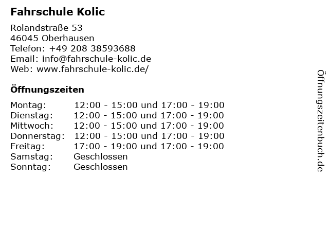 | Öffnungszeiten Fahrschule Kolic in Oberhausen anzeigen | |