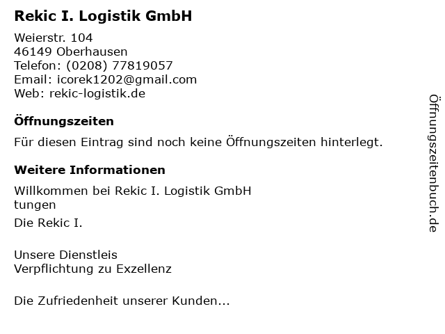 | Öffnungszeiten Rekic I. Logistik GmbH in Oberhausen anzeigen | |