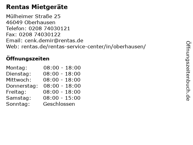 | Öffnungszeiten Rentas Mietgeräte in Oberhausen anzeigen | |