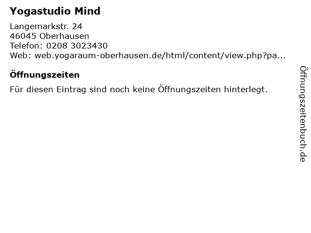 | Öffnungszeiten Yogastudio Mind in Oberhausen anzeigen | |