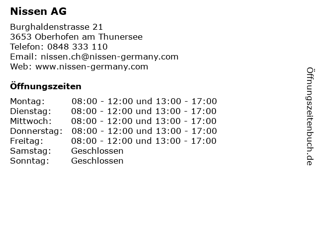 | Öffnungszeiten Nissen AG in Oberhofen am Thunersee anzeigen | |