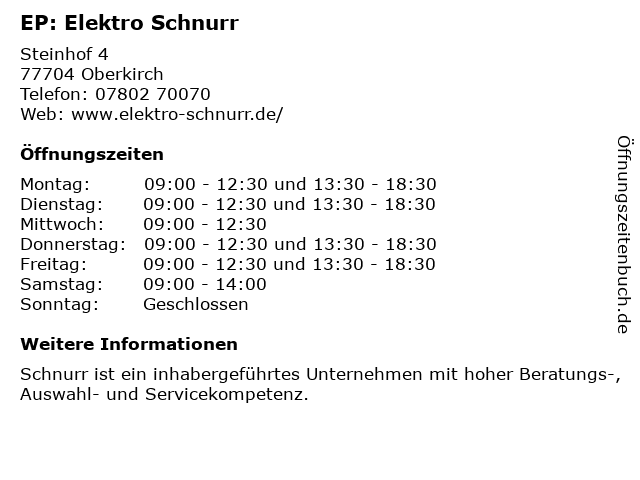 | Öffnungszeiten EP: Elektro Schnurr in Oberkirch anzeigen | |