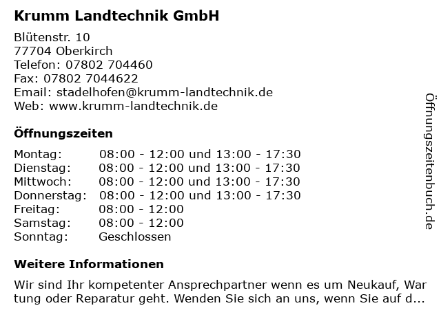 | Öffnungszeiten Krumm Landtechnik GmbH in Oberkirch anzeigen | |