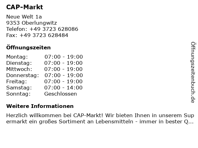 | Öffnungszeiten CAP-Markt in Oberlungwitz anzeigen | |