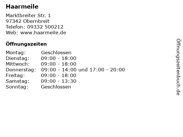 | Öffnungszeiten Haarmeile in Obernbreit anzeigen | |