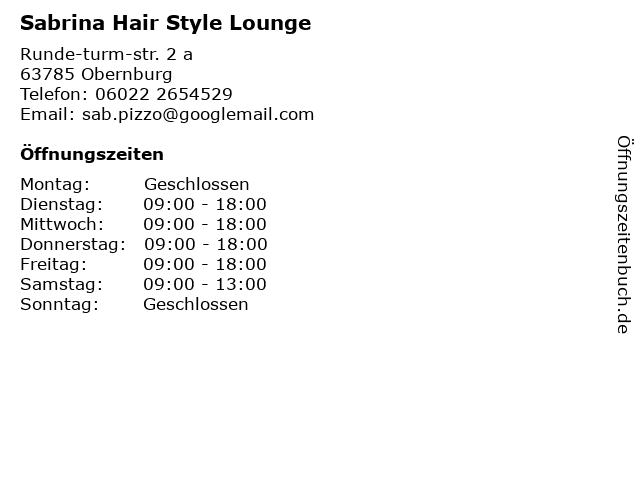 Öffnungszeiten Sabrina Hair Style Lounge in Obernburg anzeigen | |