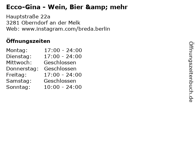 | Öffnungszeiten Ecco-Gina - Wein, Bier & mehr in Oberndorf an der Melk anzeigen | |