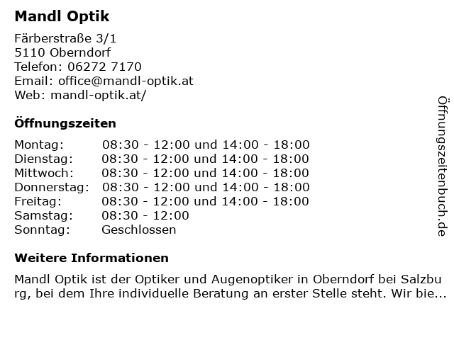 | Öffnungszeiten Mandl Optik in Oberndorf anzeigen | |
