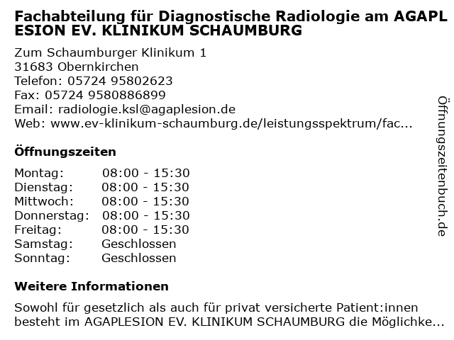 1 Ambulantes Zentrum am AGAPLESION EV. KLINIKUM SCHAUMBURG (Entfernung: 0,00 km) Zum Schaumburger Klinikum 1 , 31683 Obernkirchen 6 |